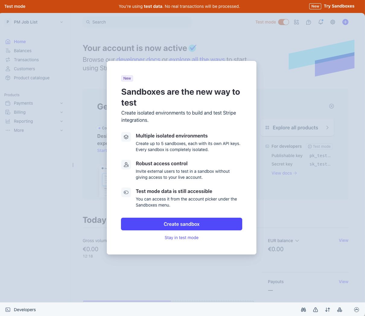 Stripe has introduced "Sandboxes" as the recommended way to create isolated test environments (documented at docs.stripe.com/sandboxes). The dashboard prompted the operator with a "Create sandbox" modal. Both models directed the operator to the legacy "Developers > API keys" path with no mention of Sandboxes.